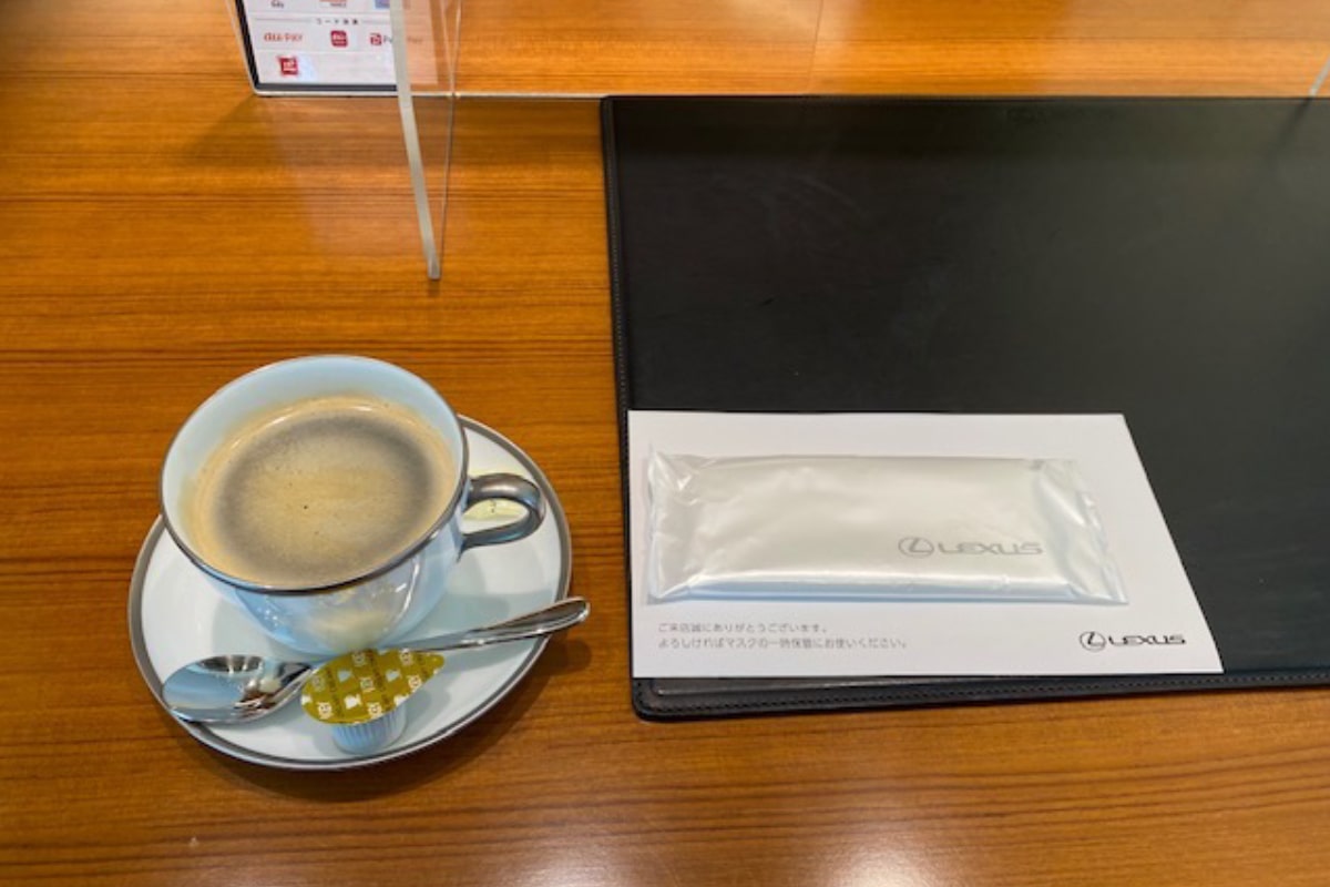 静かな店内で、ひそひそ話も聞こえてしまいそうな感じ。待ち時間の間にコーヒーをどうぞと、出てきたコーヒーは、紙コップではなく、綺麗なコーヒーカップ。紙おしぼりだけど、袋にはLEXUSの文字がプリントされて、おまけに紙製のマスクを入れるケースがでてきました。