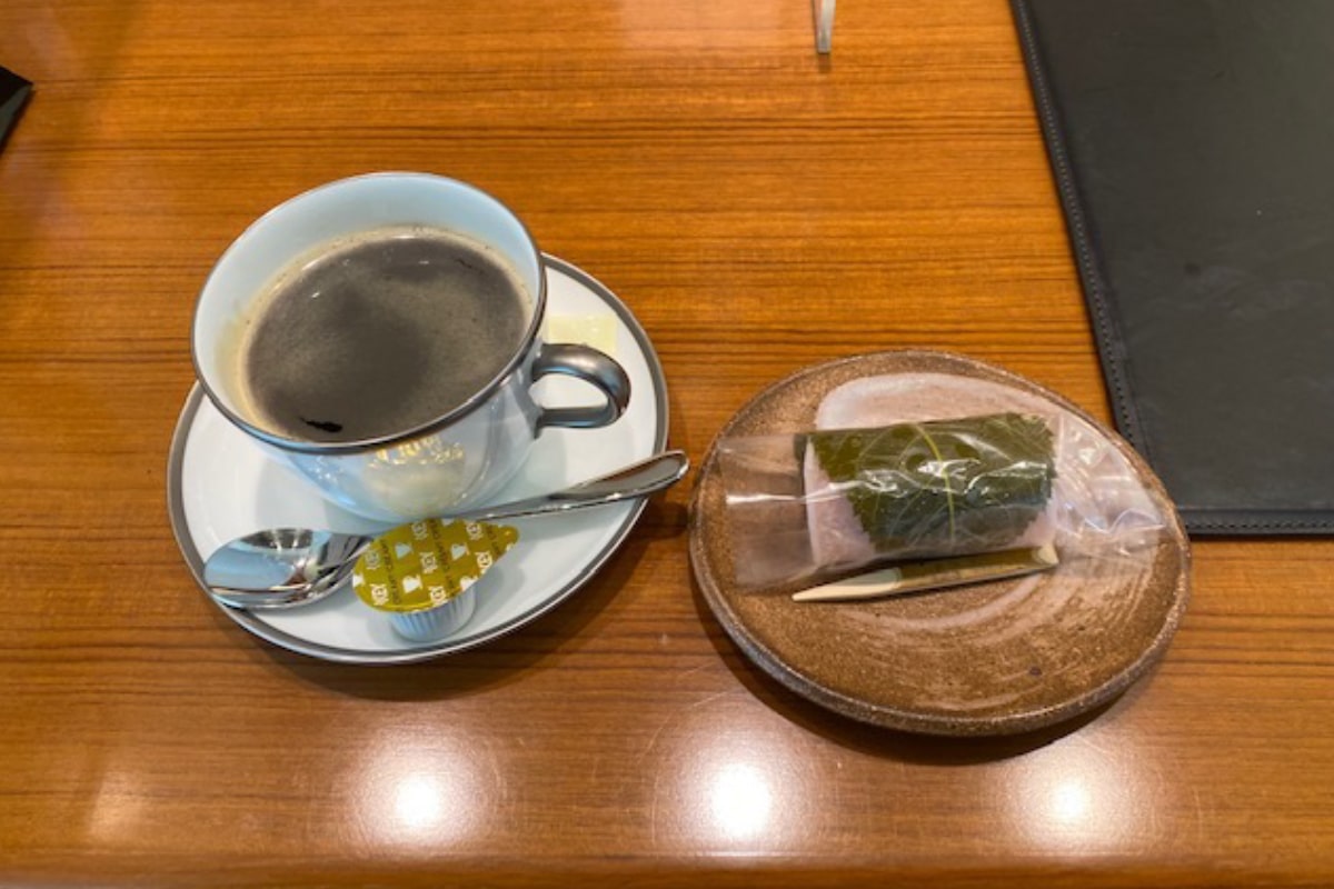 コーヒーを飲みながら、高級なレクサク車がズラ~っと並んだ外を眺めていたら、ただいま季節のお菓子で桜餅をご用意できますがと、お姉さまの再登場。少し恐縮しながら、お願いしたら、美味しそうな桜餅が出てきました。塩味がほんのり利いたシソの葉が、甘さを引き立てます。甘いものが好きな自分なので、一気に食べてしまいました。